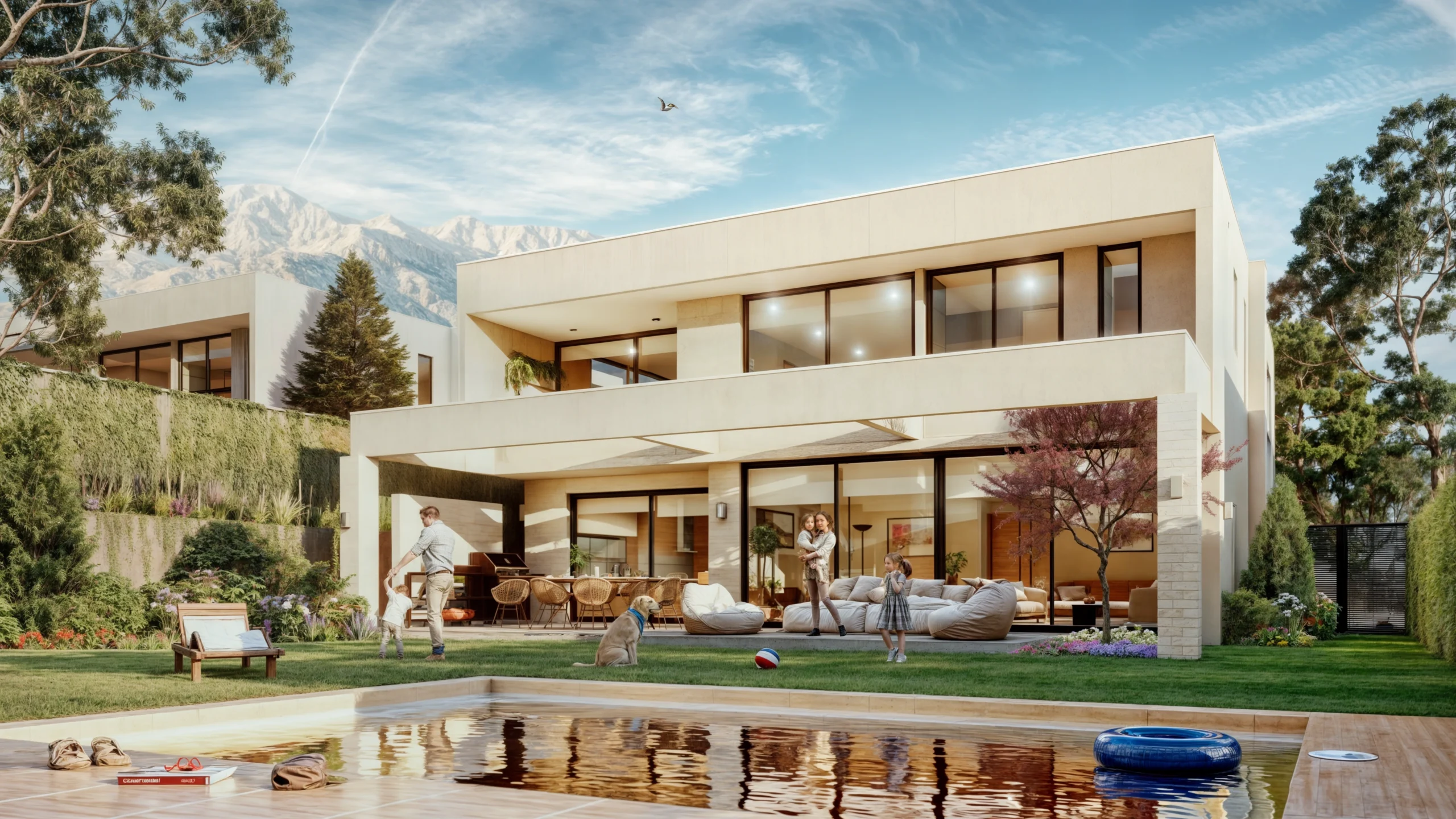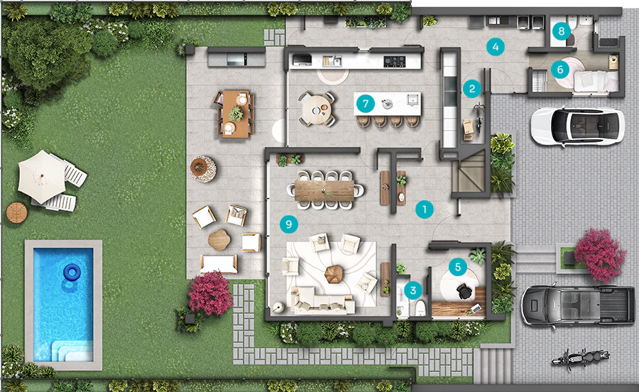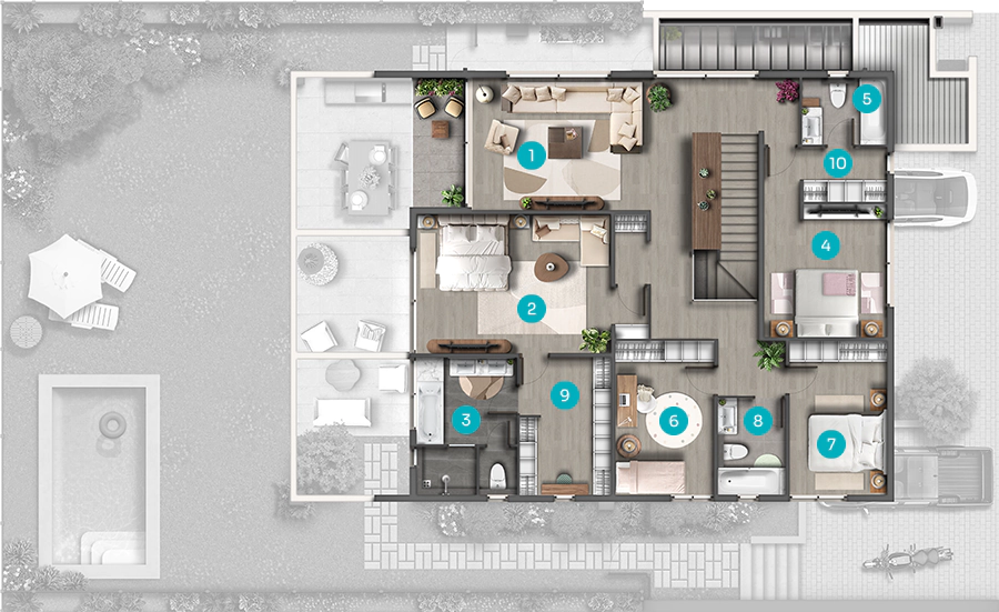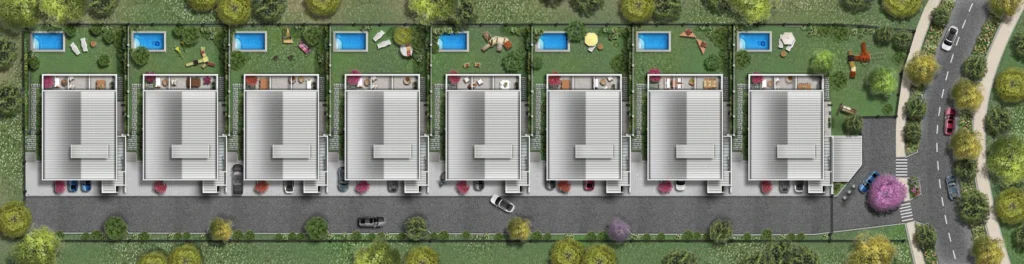 Espacios sociales que fluyen hacia el jardín, cocina protagonista de 35 m² diseñada con SCA junto a Studio MK, circulaciones claras y 5 dormitorios / 5 baños pensados para la vida diaria con estilo. 371 m² totales en casas de baja densidad (sólo 8), con superficies y materialidades que privilegian el confort silencioso y la eficiencia.